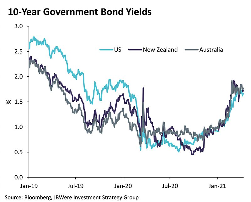 However, JBWere do expect continued volatility in financial markets over the next quarter or two as investors try to assess the anticipated economic recovery. The main question will be whether the recovery continues at a rate that boosts company profits or whether share markets will become overheated, forcing central banks to raise official cash rates more than anticipated, crimping company profits and reducing share price valuations.